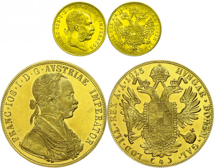 Zwei der am häufigsten vorkommenden und in fast jeder Goldmünzensammlung vertretenen Goldmünzen Europas, sind die 1- und 4- Dukaten-Prägungen Österreichs. Die 1-und 4-Dukaten-Stücke mit der Jahreszahl 1915 sind stetig laufende Staatliche Nachprägungen/Neuprägungen. Das kleine 1-Dukaten-Stück hat ein Feingewicht von etwa 3,44g. Das große Äquivalent zu 4-Dukaten bringt immerhin 13,76g Feingold auf die Waage. Beide Münzen werden nahe am Goldpreis gehandelt.