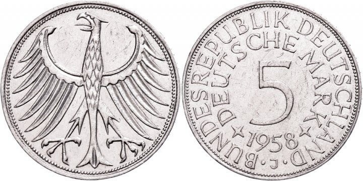 Aside from the first five 5 DM commemorative coins, the popular 5 mark coin of 1958 with the mint mark J is the most interesting coin of the regular 5 DM circulating coins from today's point of view. The purchase prices usually start at 100.– euro in average condition (see picture). Very fine coins (PF) can also cost several thousand euros.